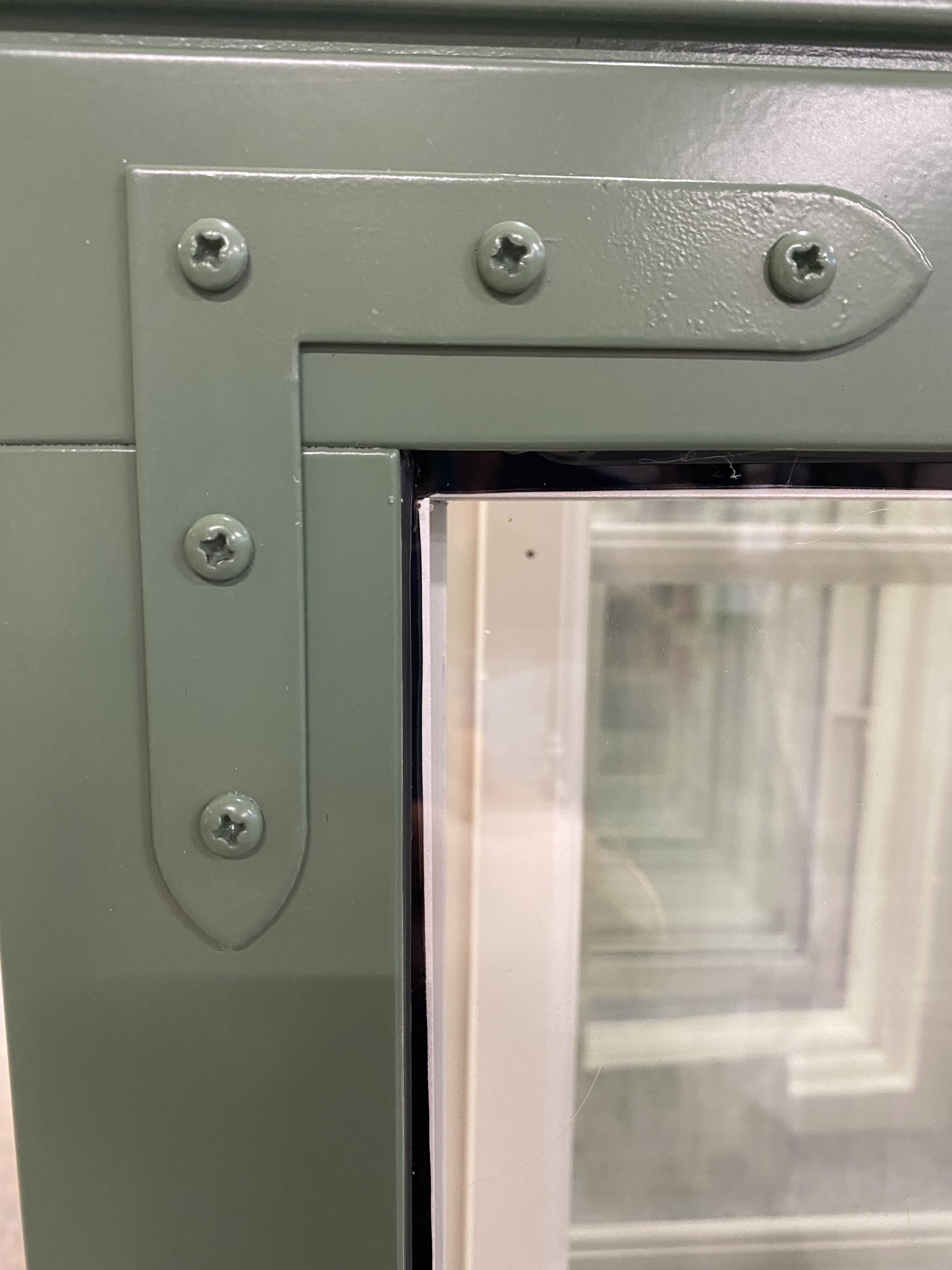 - Bilde viser hjørnejern i typisk jugendstil. Kan også leveres med rettsporete skruer.
